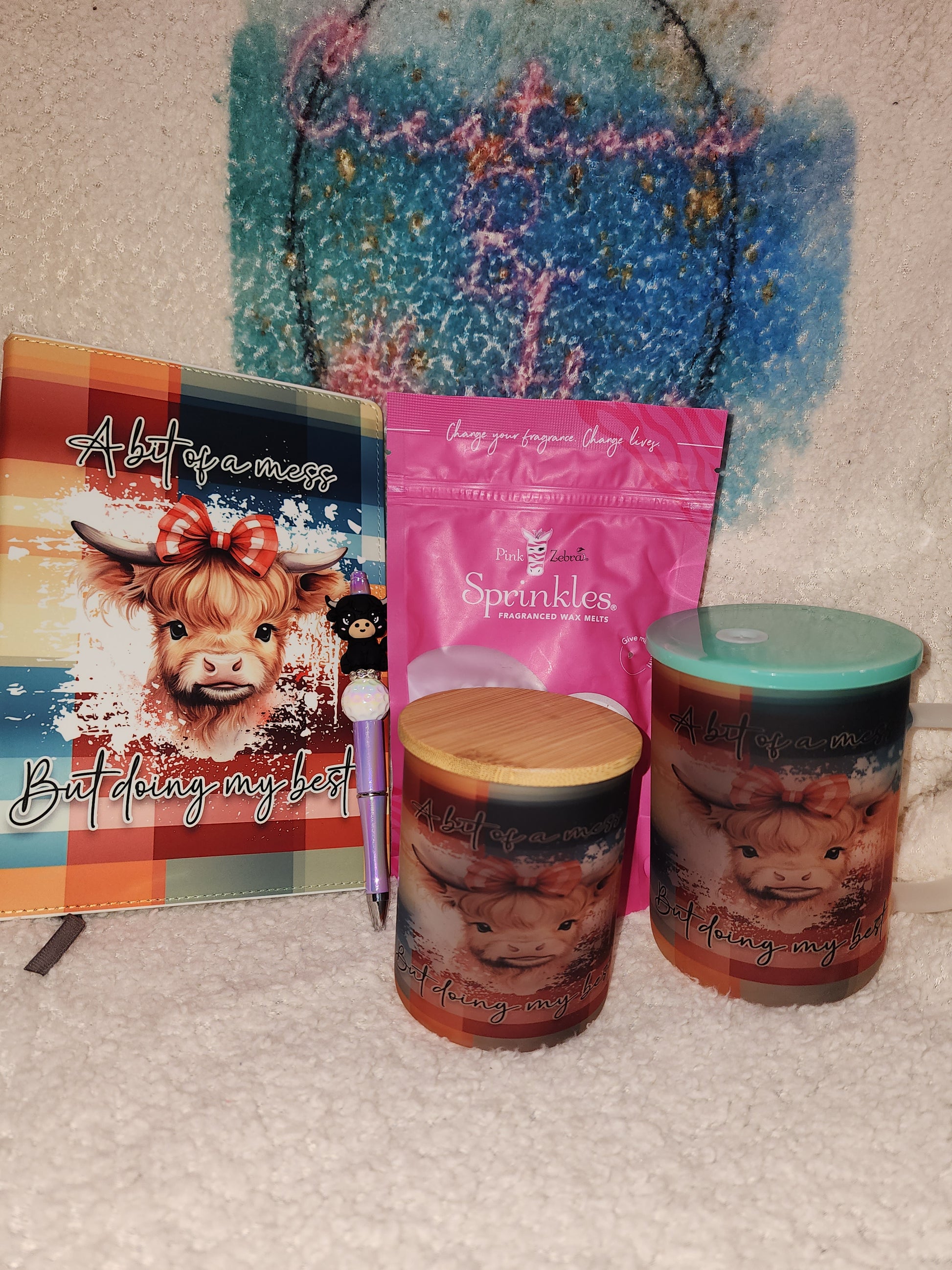 Each bundle comes with a personalized 17oz mug. Candle with wick, and notebook. Also comes with a pen and bag of sprinkles.